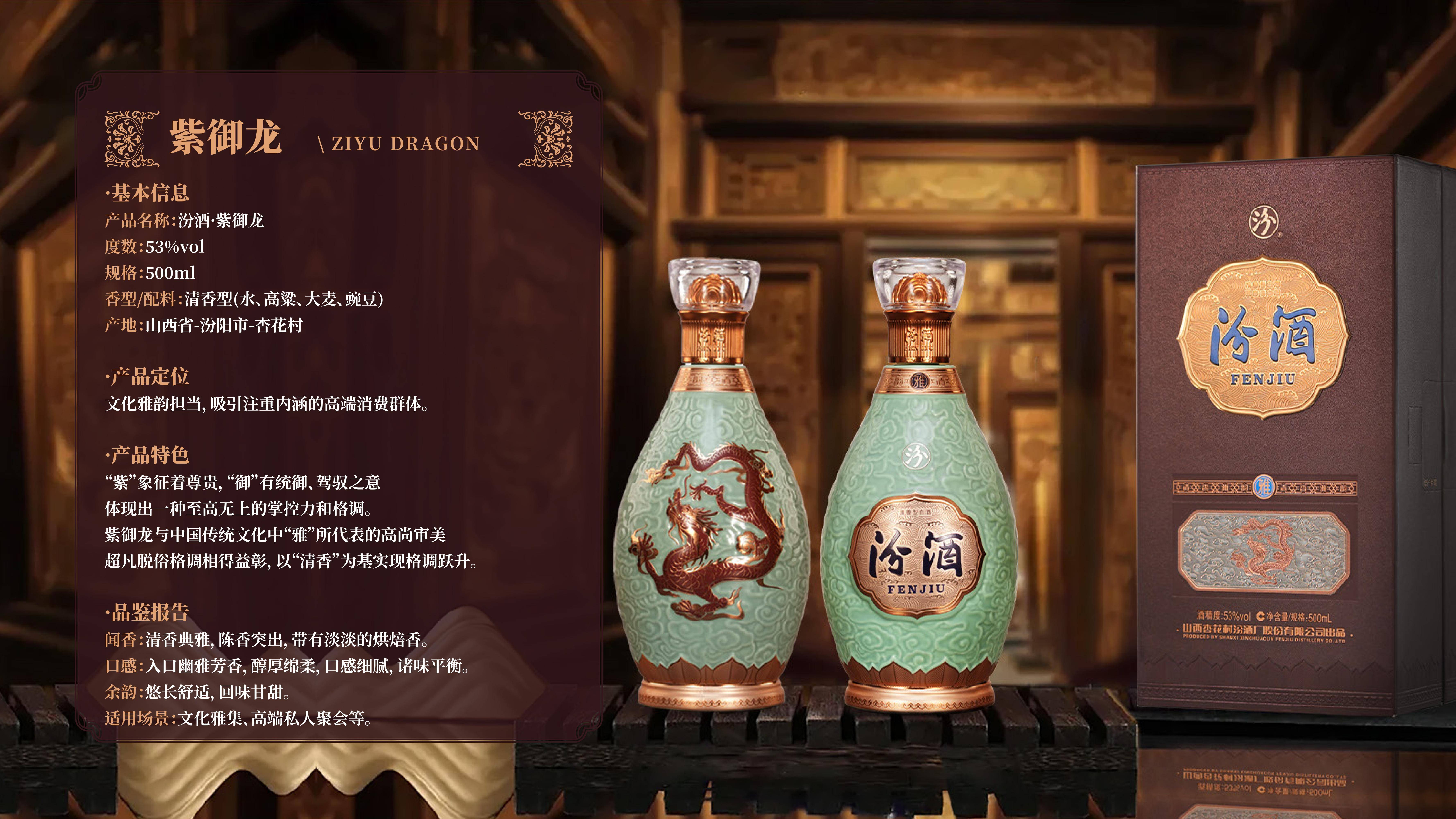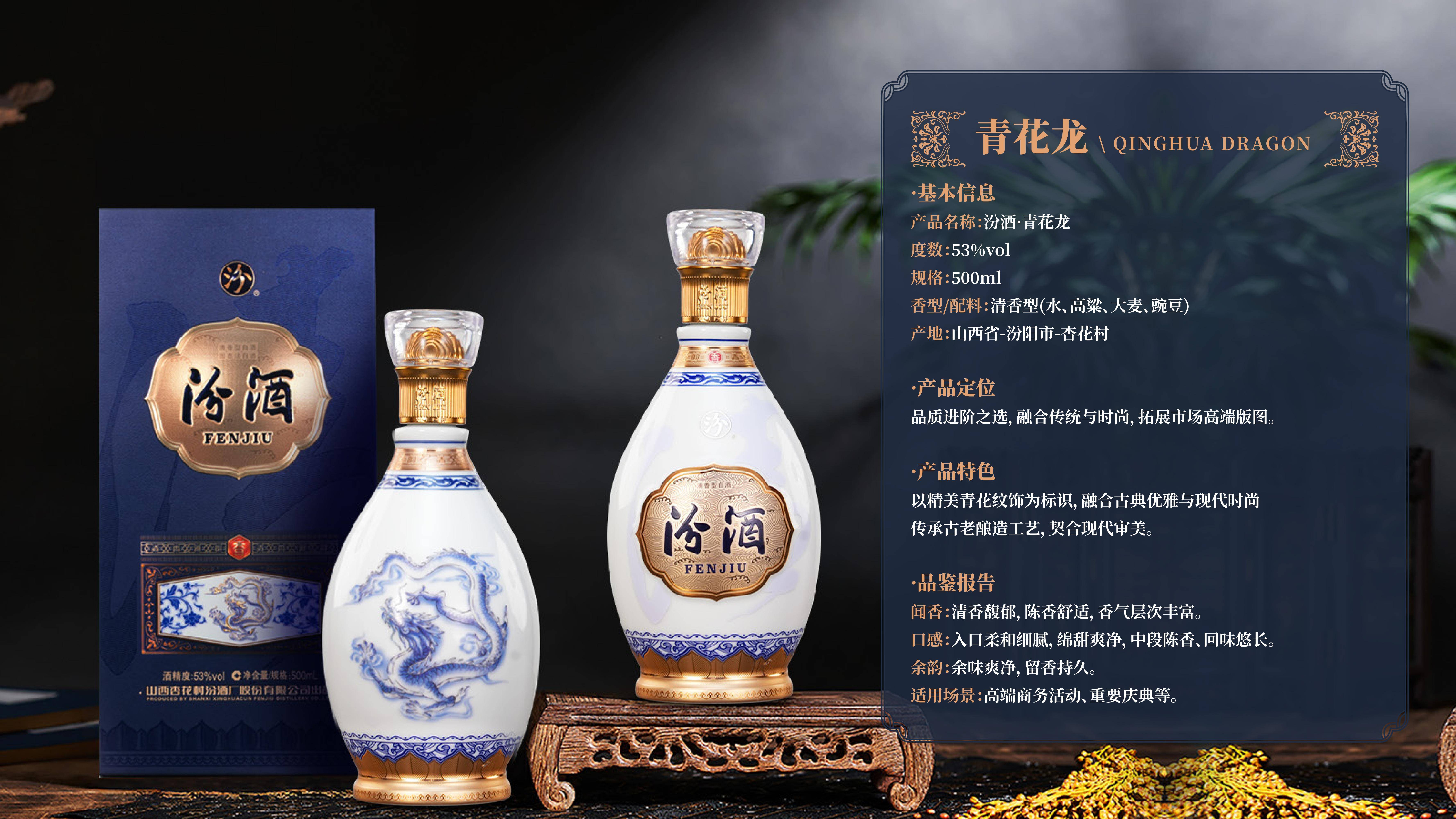 作为汾酒高端化战略的核心载体,中国龙系列的每一处细节都彰显着千年匠心与文化底蕴。该系列取故宫珍藏元代蓝釉白龙纹盘之龙韵,凝元明清三代匠魂,将三爪古龙神韵与帝王五爪威仪相融,龙鳞化酒纹、釉色融瓶身,实现了传世孤品东方龙魄与清香美酒的完美结合。瓶身设计更是匠心独运,水晶龙瓶盖源自西汉错金铜博山炉,将仙山意境凝于方寸;精湛浮雕工艺让祥云灵龙栩栩如生,珍稀琉璃瓶身澄澈通透、孔雀蓝釉色尽显绮丽;瓶底莲座承祥,承载着圣洁吉祥的美好寓意,未饮其酒,先赏其韵。